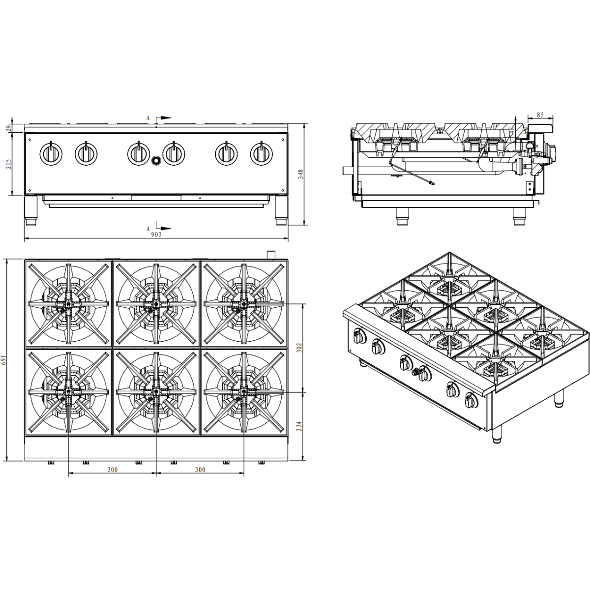 This Six Burner Gas Top is ideal for smaller catering establishments who require a small and powerful hob. This is achieved with its adjustable legs and 3/4″ rear gas connection that reduces clutter. It comes complete with easy to remove heavy duty cast grates, and a pull out oil tray with rounded edges to prevent heat transfer, as well as a modern safety cut out feature that allows for safety prioritization in your establishment.